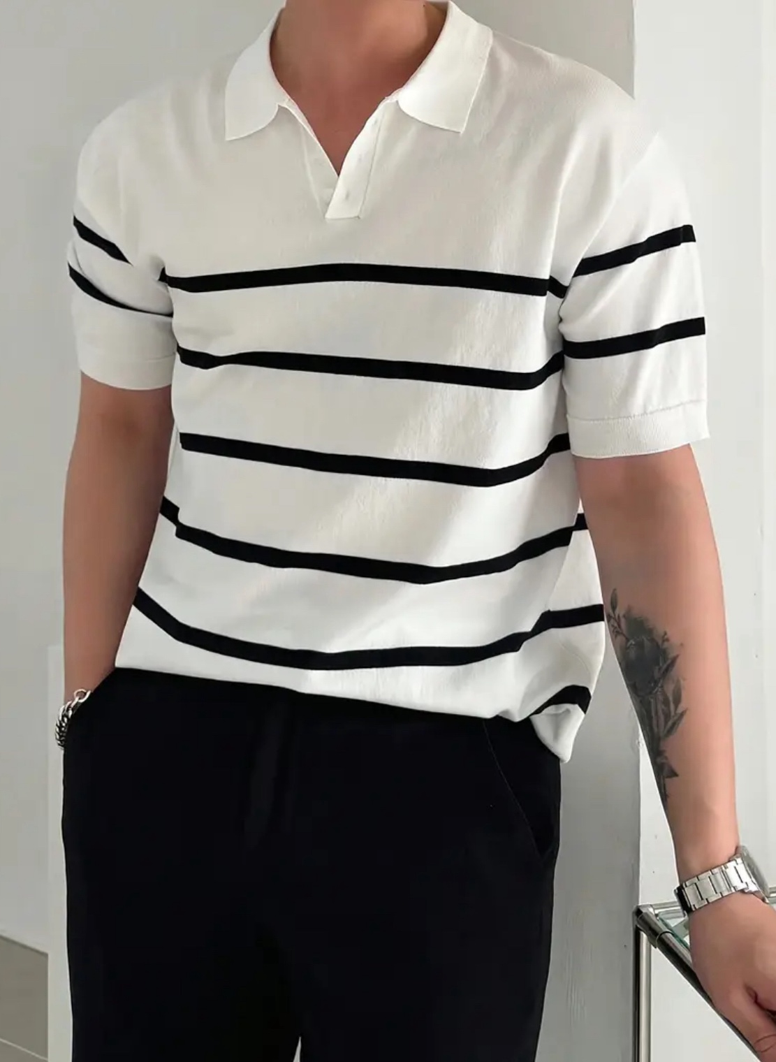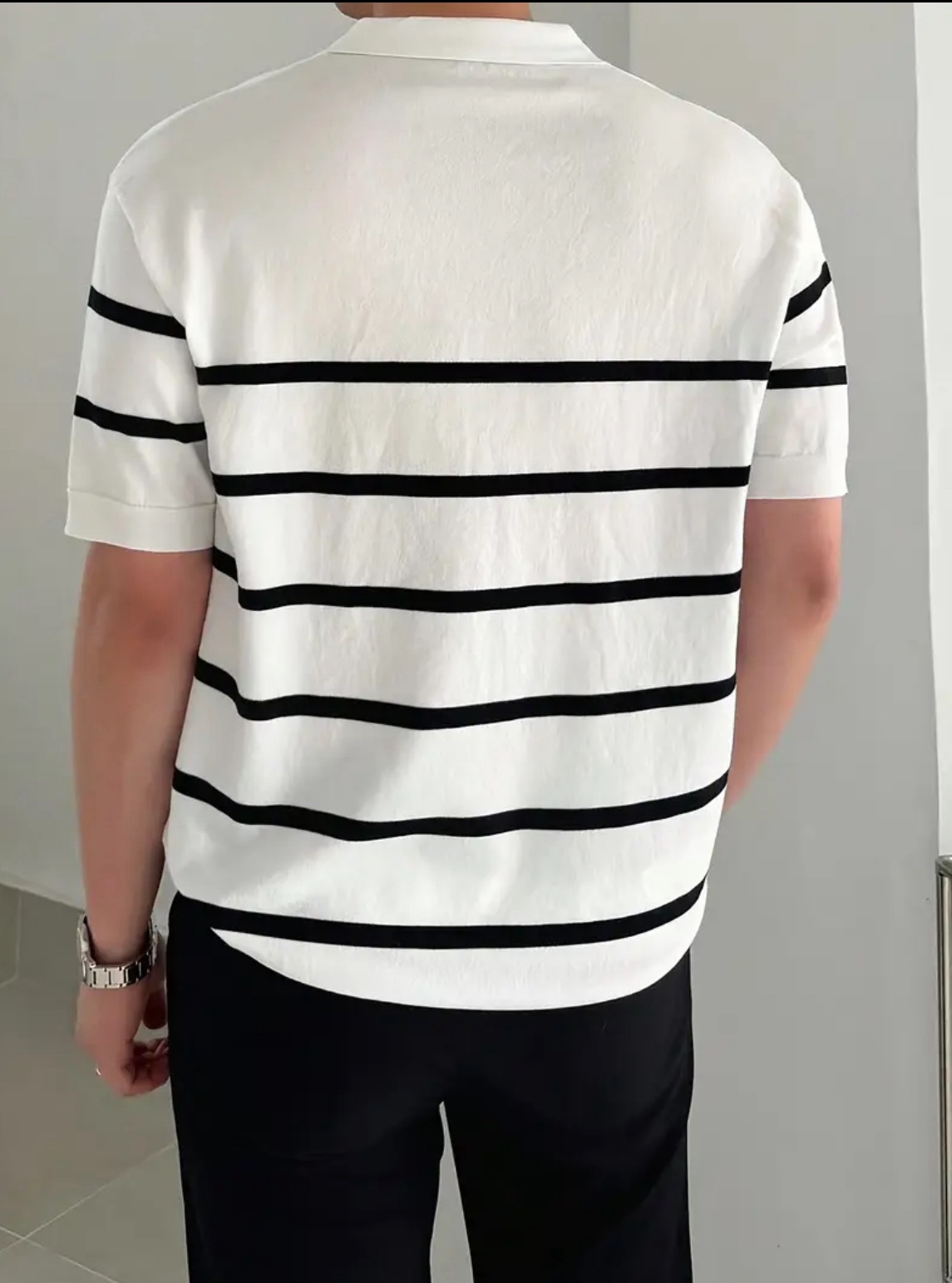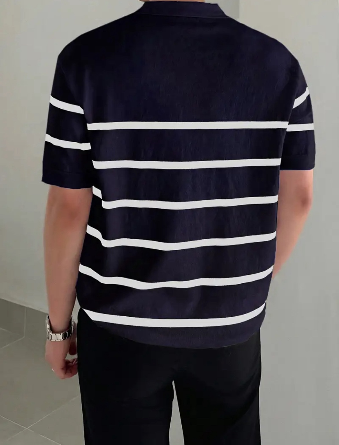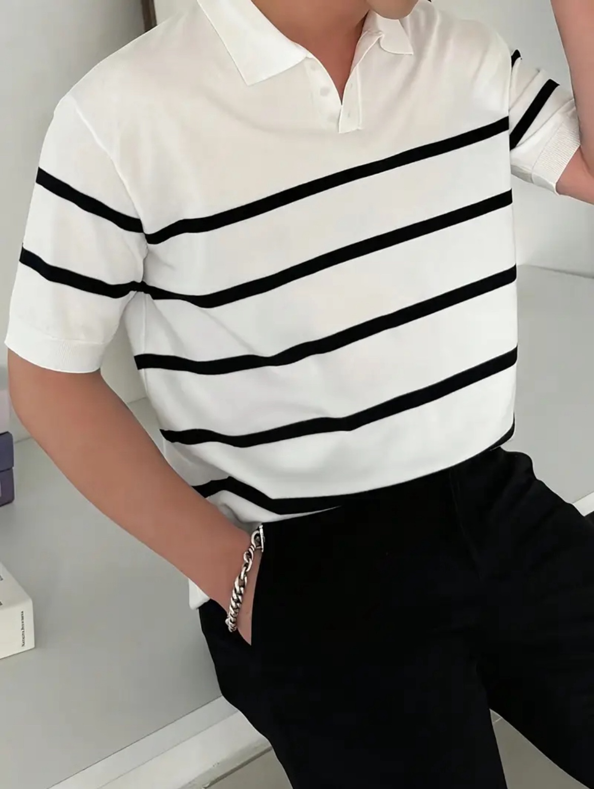 남성용 슬림핏 스트라이프 폴로 니트 셔츠