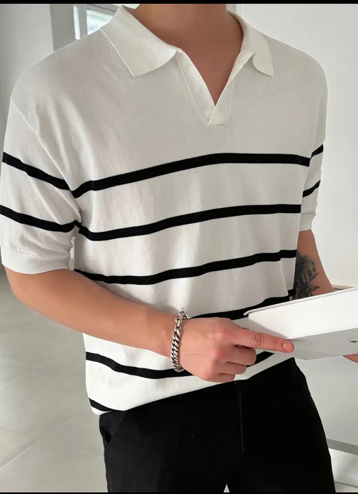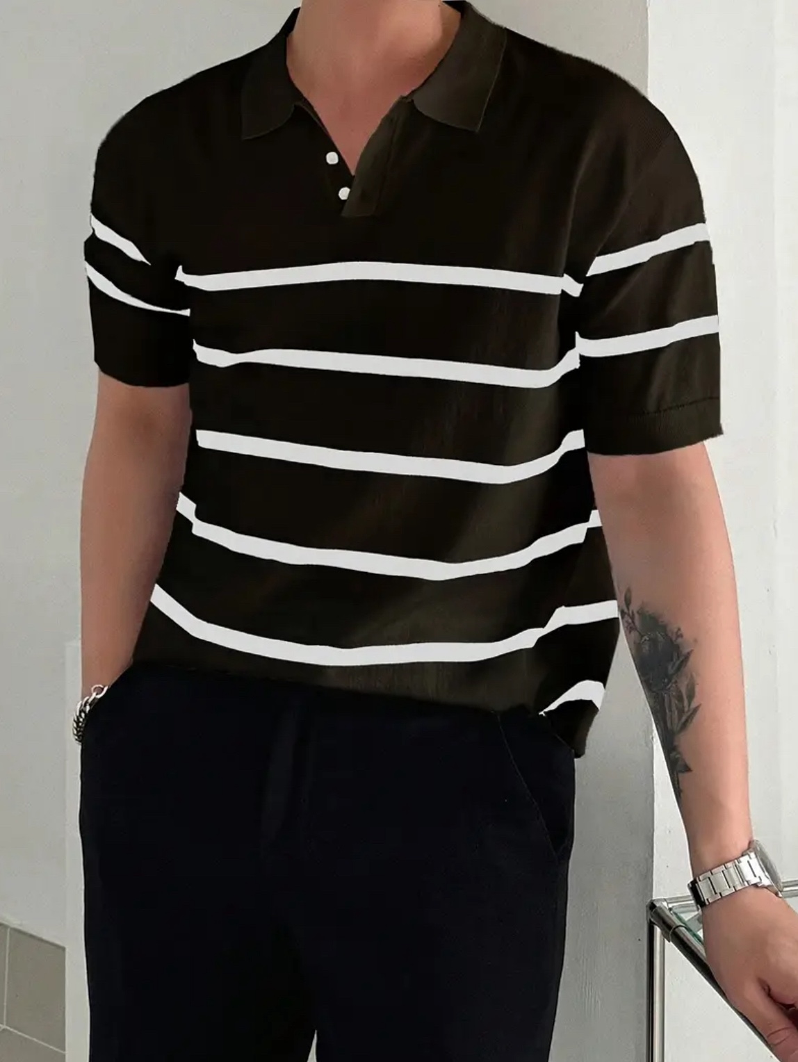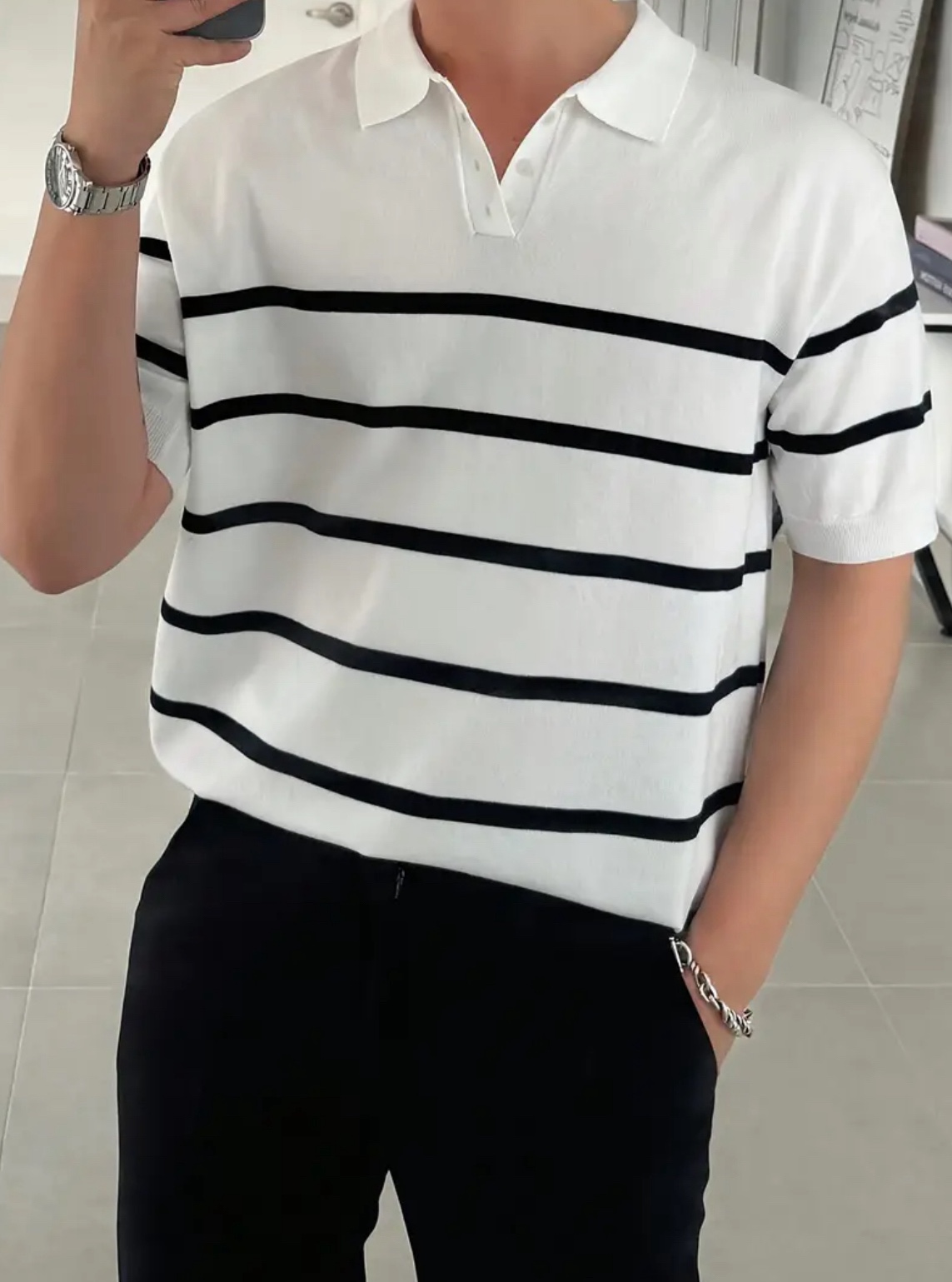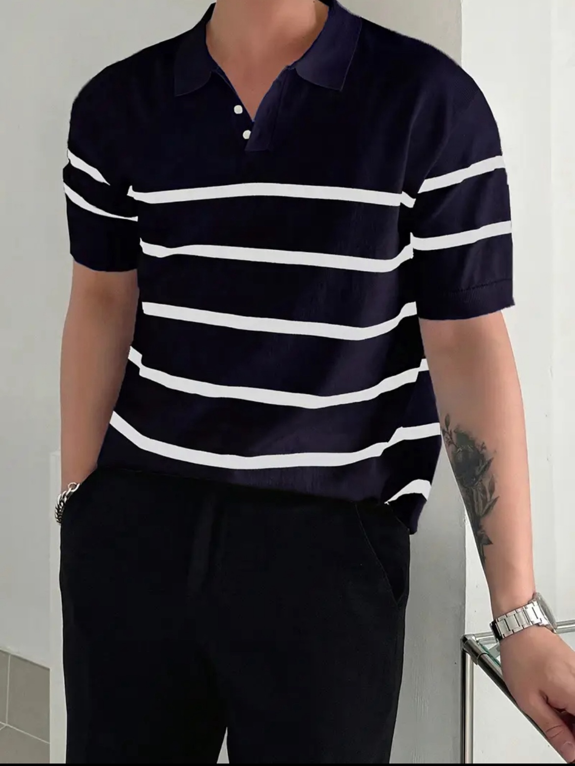 남성용 슬림핏 스트라이프 폴로 니트 셔츠