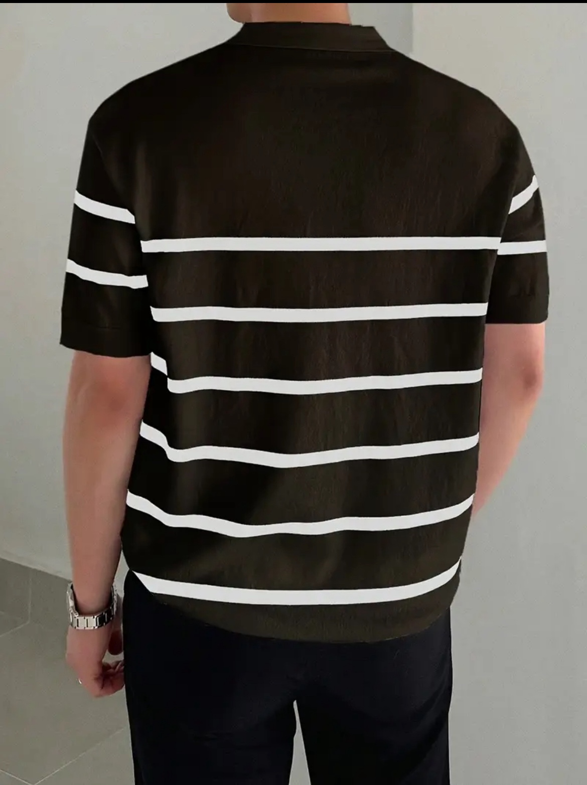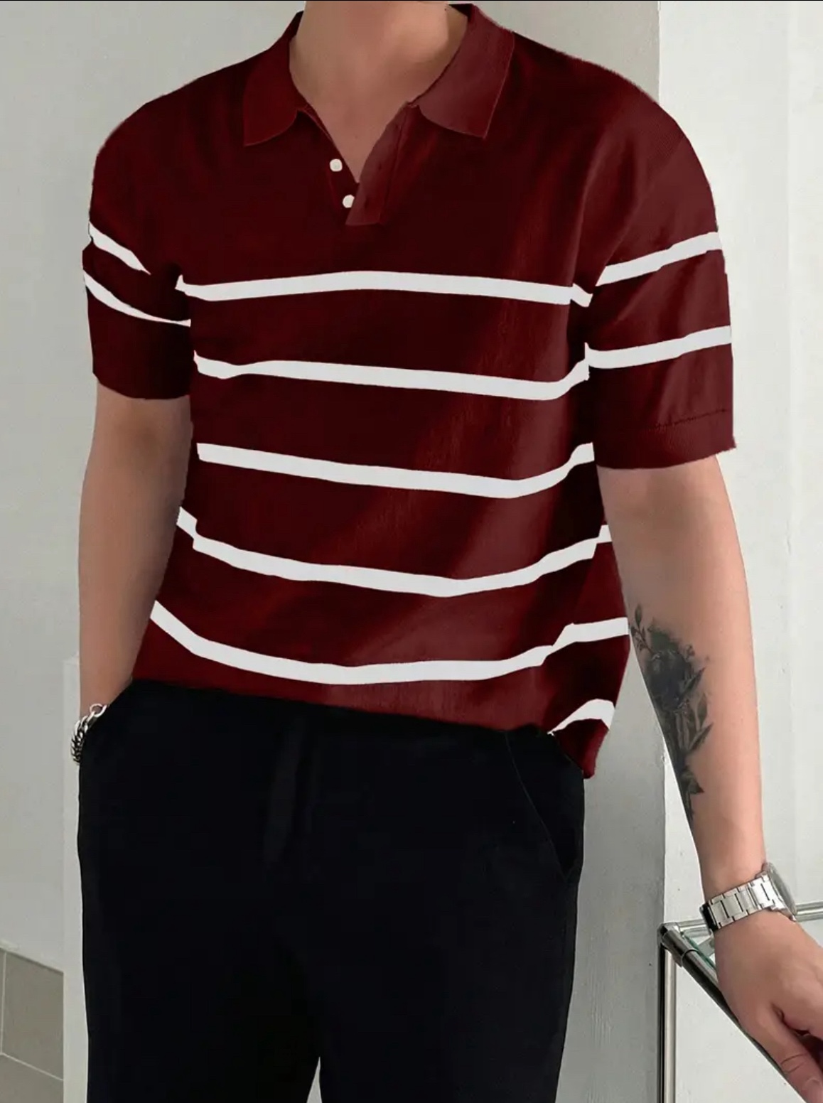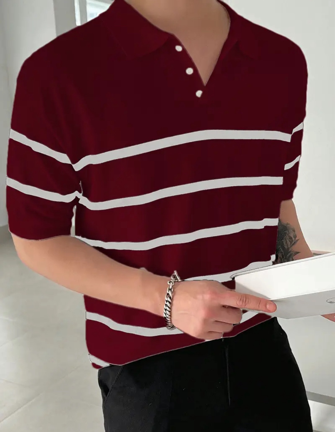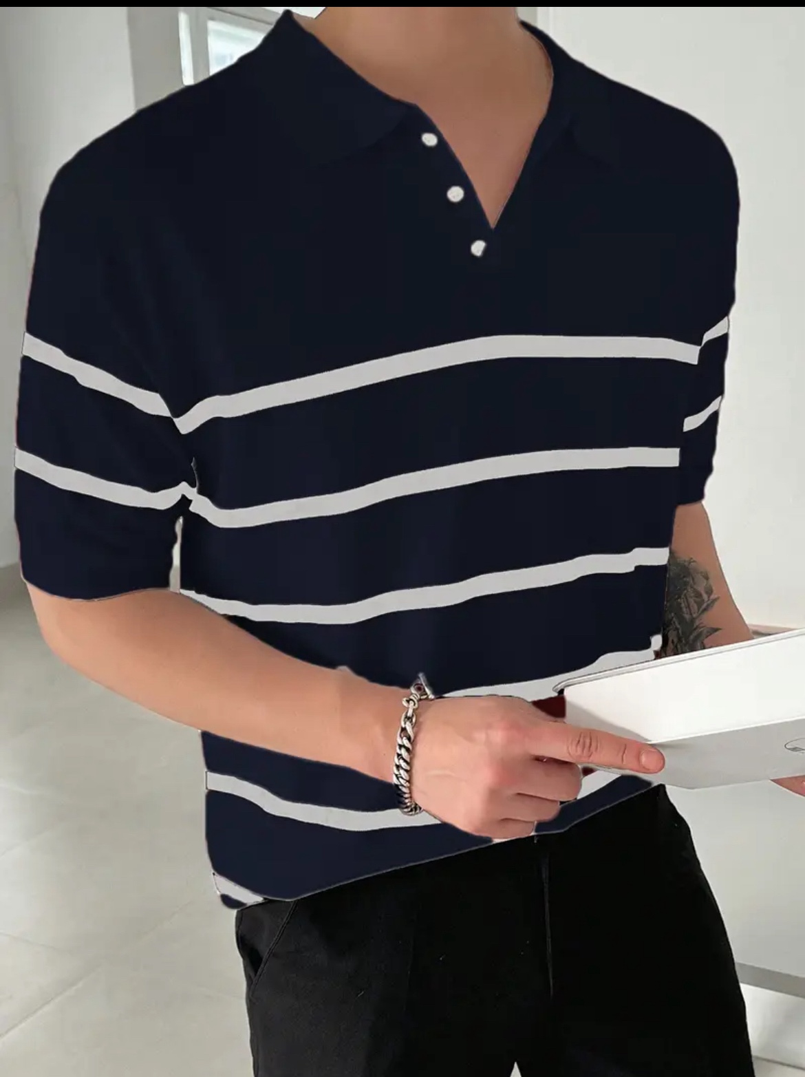 남성용 슬림핏 스트라이프 폴로 니트 셔츠
