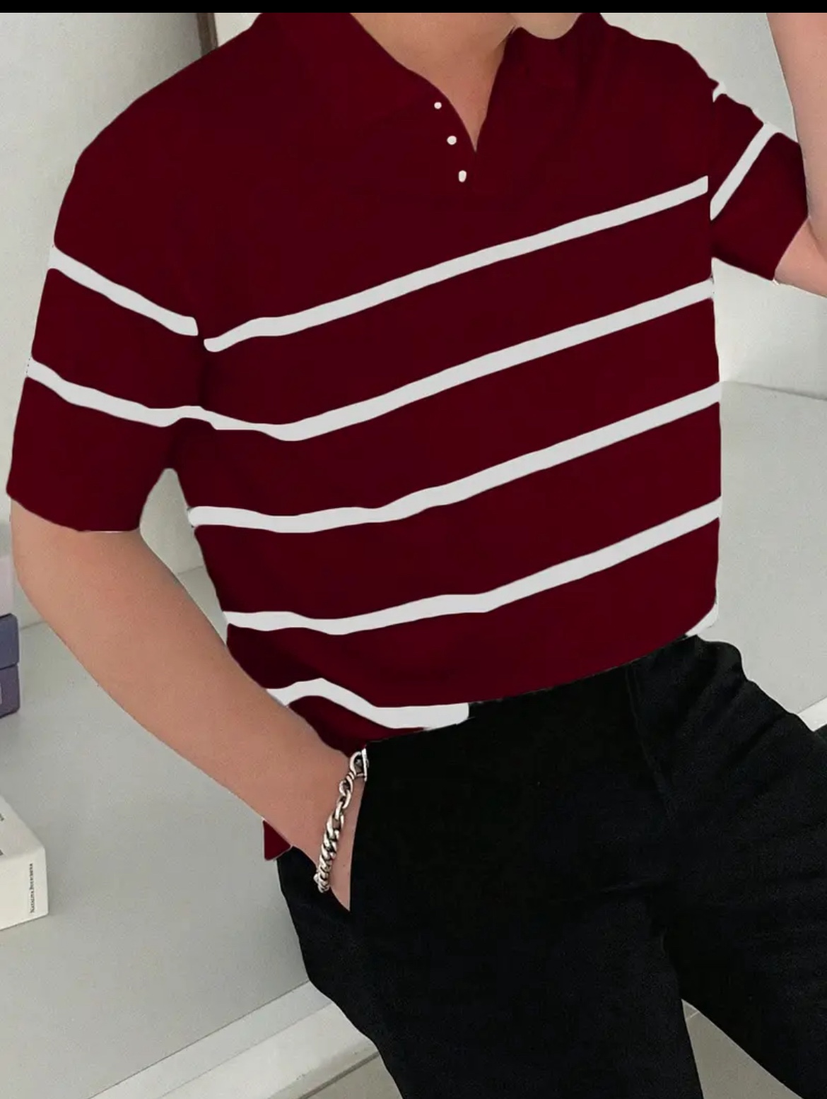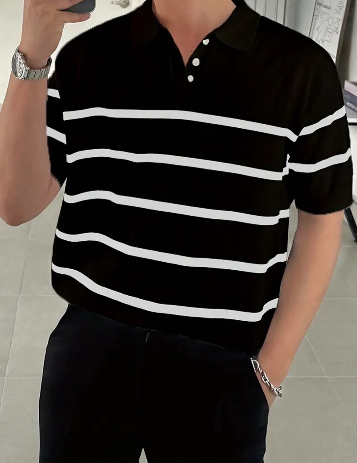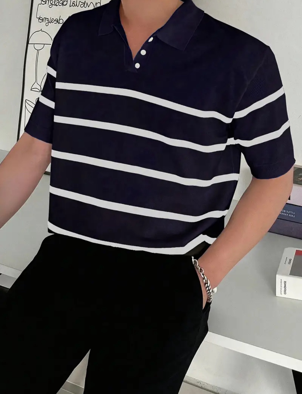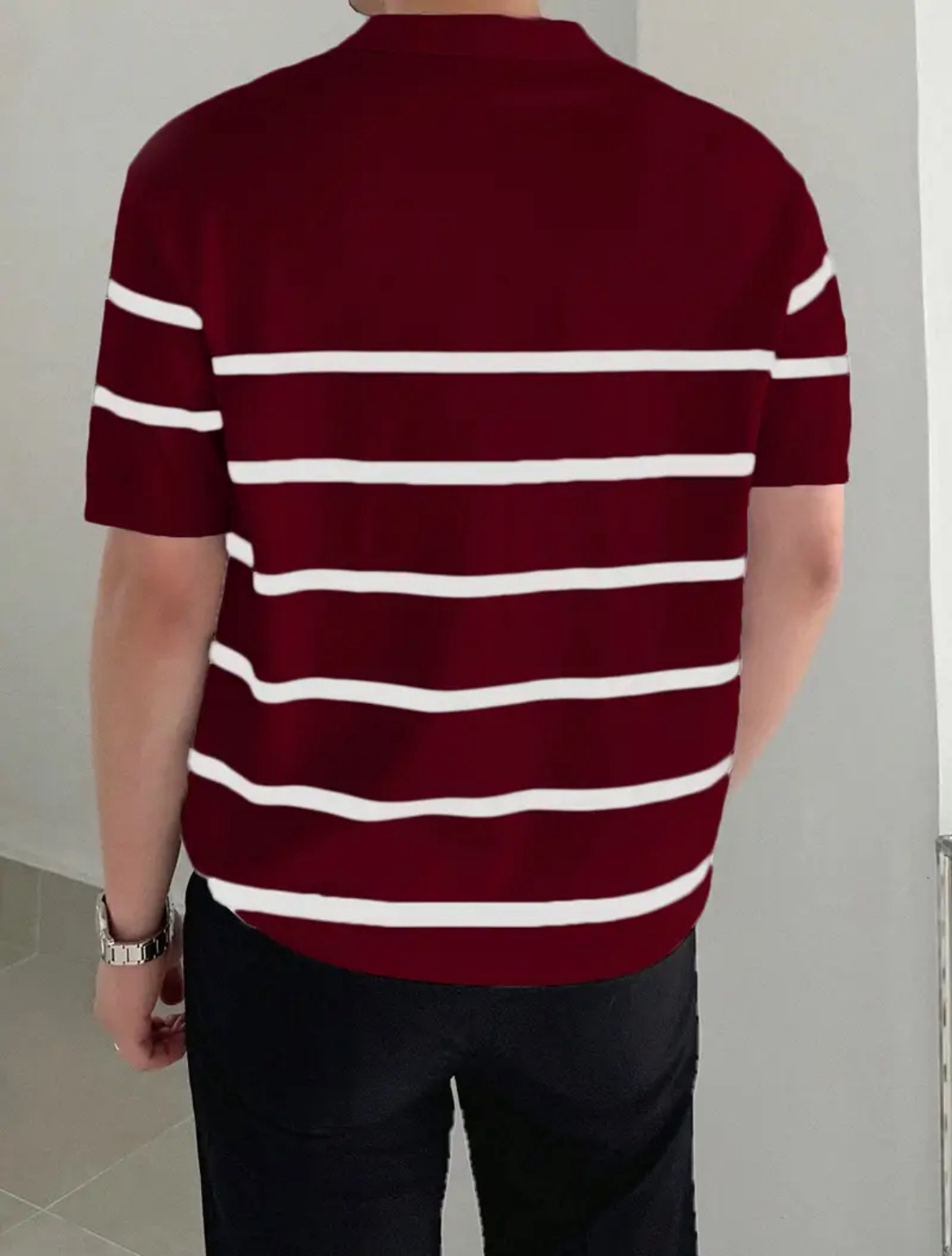 남성용 슬림핏 스트라이프 폴로 니트 셔츠