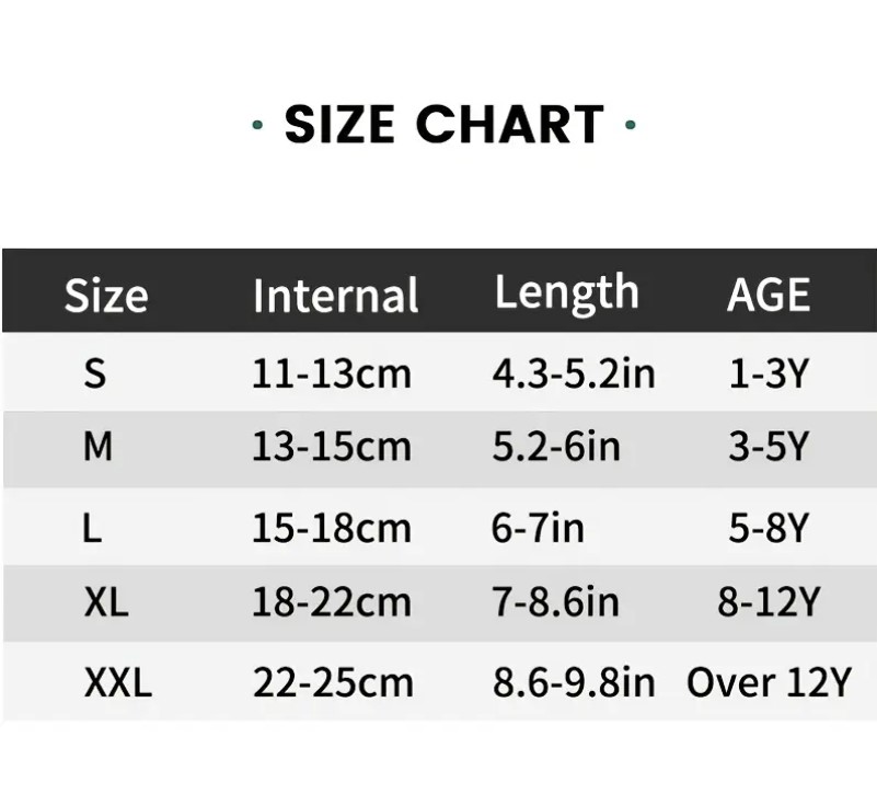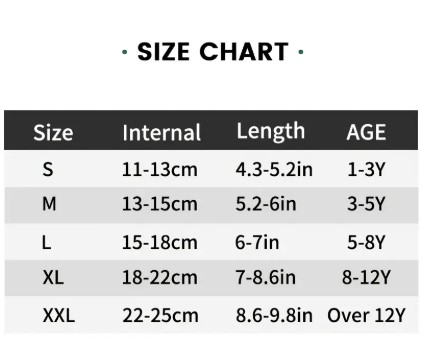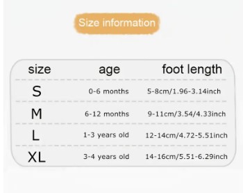 S(0-6개월/6-8CM),M(6-12개월/9-11CM),L(1-3세 /12-14CM),XL(3-4세/14-16CM)